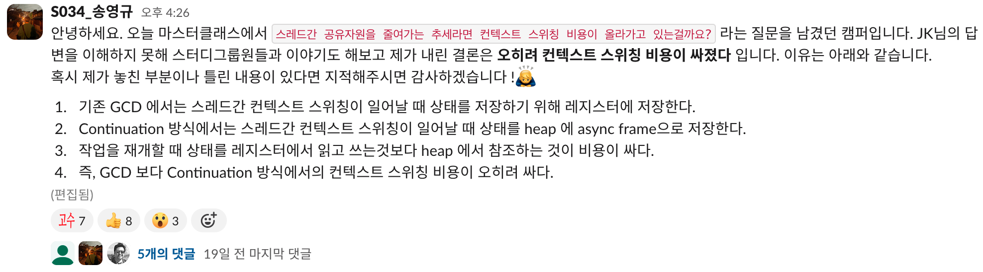 기억에 남는 건 Swift Concurrency 를 주제로 한 마스터 클래스를 듣고 Continuation에 대해 토론하며 로우레벨의 Context Switching 까지 비교해보았던게 기억에 남는다ㅎㅎ