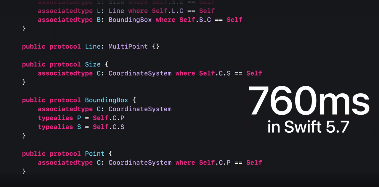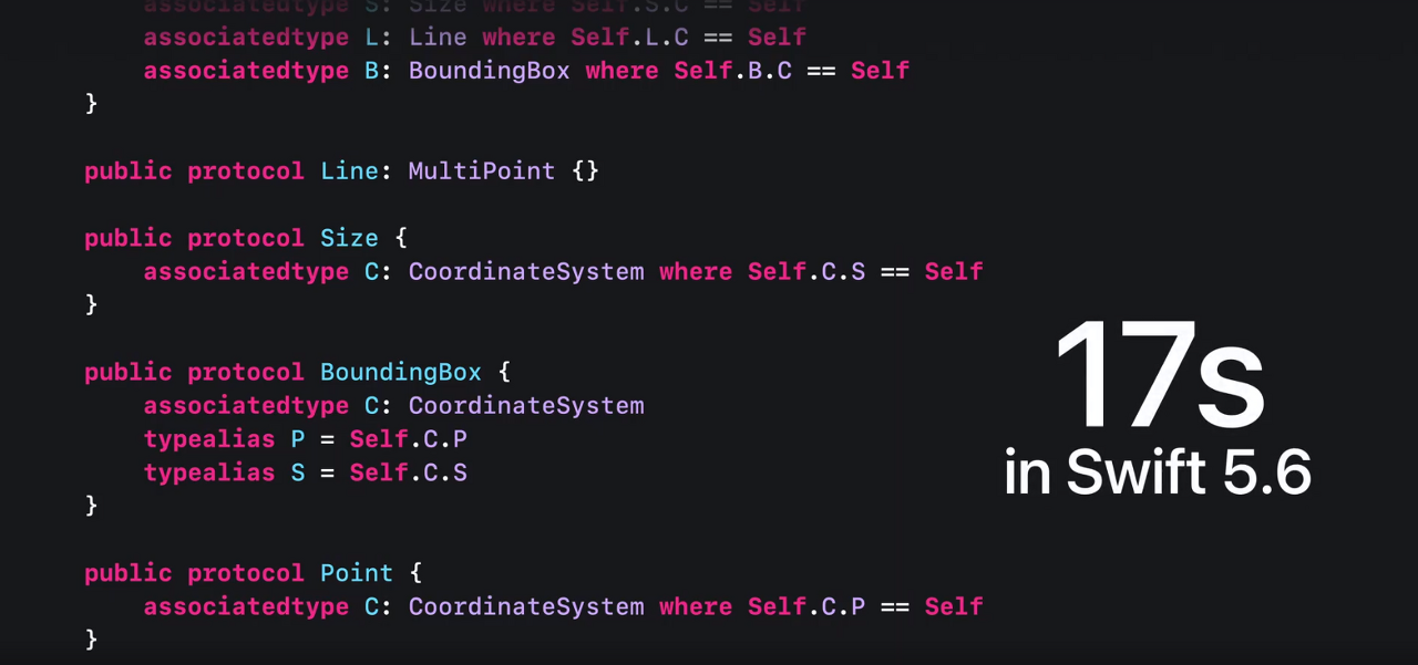 특정 프로토콜 및 관련 유형의 구성에서 유형 검사 시간은 Swift 5.6에서 기하급수적으로 증가하지만, Swift 5.7에서는 선형적입니다.