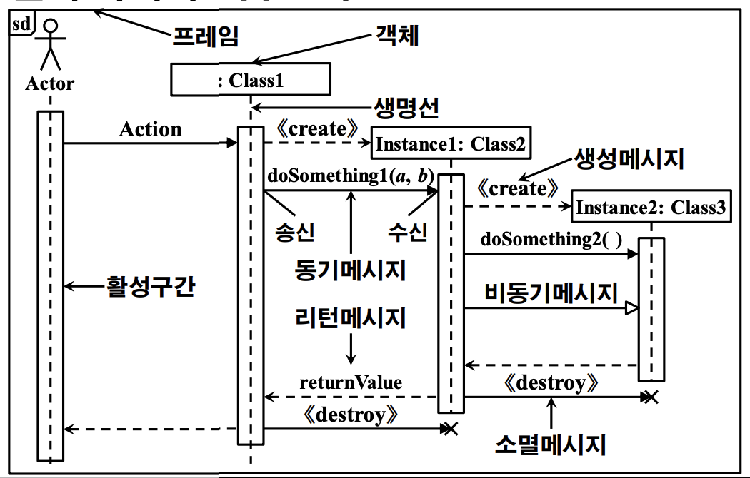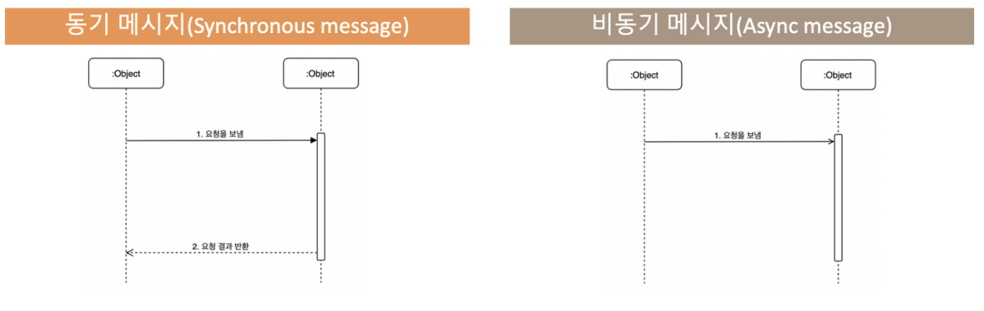 | 동기 메시지(Synchronous message) | 메시지 전송 객체가 계속하기 전까지 동기 메시지에 대한 응답을 기다림. 프로그램 내 일반적인 함수 호출과 동일한 동작 방식의 메시지를 표현 |