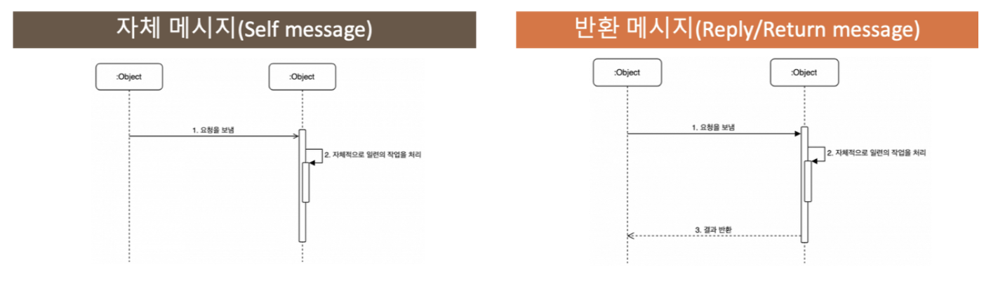 | 자체 메시지 (Self message) | 인스턴스간의 상효작용 뿐만 아니라 하나의 인스턴스에서 처리를 하는 방법도 종종 있습니다. 이럴때는 self 메시지를 사용할 수 있습니다. self message는 본인의 lifeline으로 재귀 하는 화살표를 가지고 있습니다. 자신에게 보낸 메시지입니다. 결과로 생성된 실행 발생이 전송 실행 위에 나타남. |