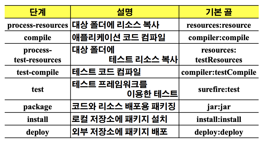 - pom.xml(project object model): 프로젝트 root에 존재하는 파일로, 프로젝트 정보 및 의존성 관리, 단계별 골 설정