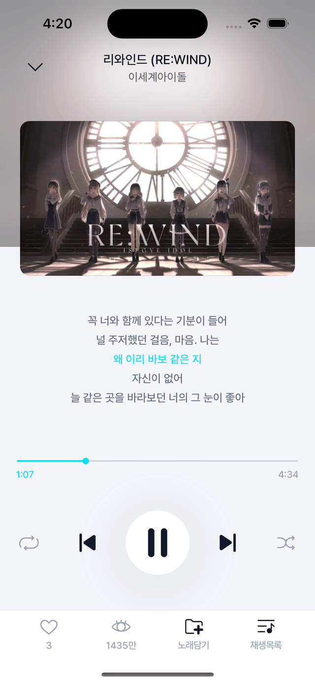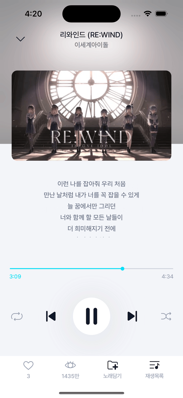 3. 스크롤 가사 탐색 기능 : 가사를 스크롤하면 멈춘 위치의 가사를 재생
