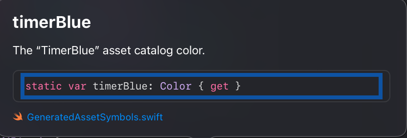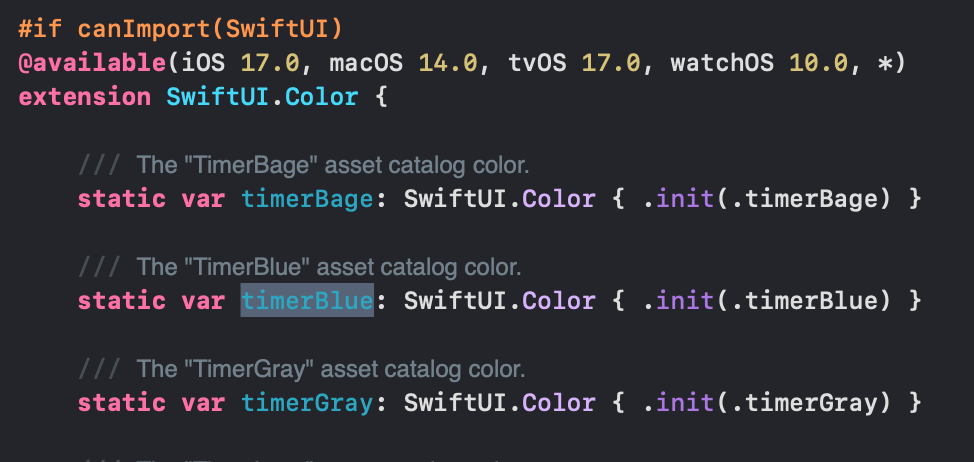 2번 Color 의 접근 권한, 문제가 되는 Color.timerBlue 는 XCode 15에서 생긴 GeneratedAssetSymbol파일에 있다고 한다.