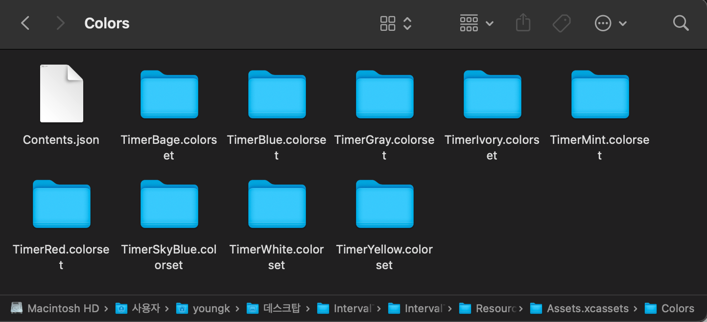 가장 처음으로 Assets의 파인더 구조를 확인해봤는데, ~/Assets.xcassets > Colors 로 정상적이었다.