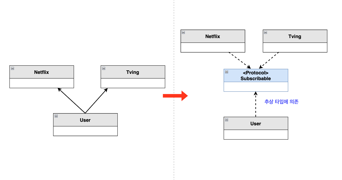Swift에선 의존성 역전을 Protocol 을 사용하여 일으킬 수 있습니다.