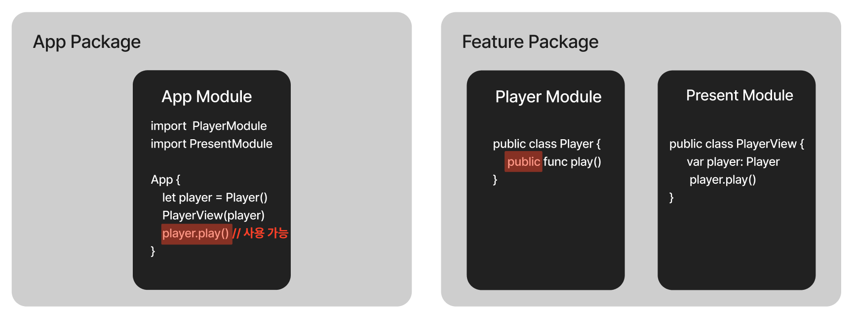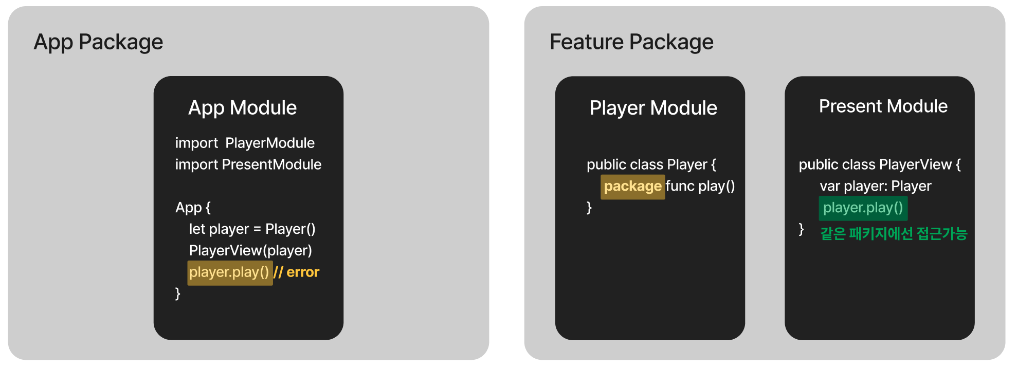 package 접근제어자가 없다면 다른 모듈에서 사용하기 위해 public 접근 제어자를 썼을겁니다. 하지만 public 은 모든 모듈에서 접근 가능하기 때문에 원하지 않는 모듈에서 접근해 안티 패턴이 될 수 있습니다.