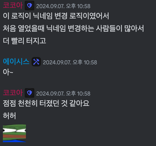 닉네임 변경 로직에 문제가 있었던 걸로 확인 후 문제를 해결했다고 합니다ㅎㅎ